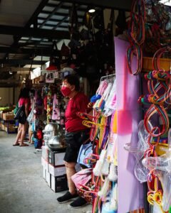 A carnival of antiques, neon lights, and hawker snacks. The aroma of chicken rice balls mixes with coffee and fried pastries.